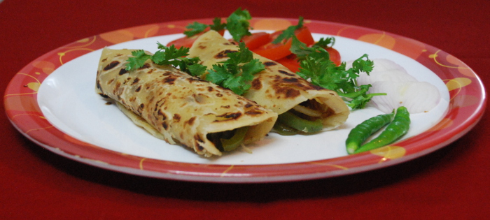 - Place (length-wise) half of the saluted onion – capcisum on a side of the chapati.