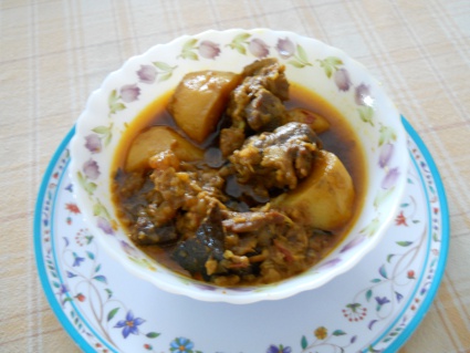 - Before the mixture becomes too dry, add the meat, cook in low flame, string all the time.