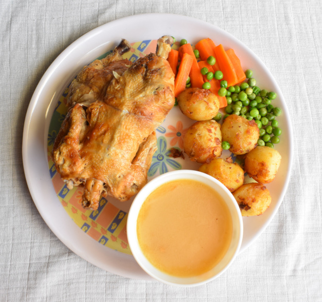 4. Place the whole chicken on a full plate, place the vegetables at the sides, so that it looks nice and tasty.